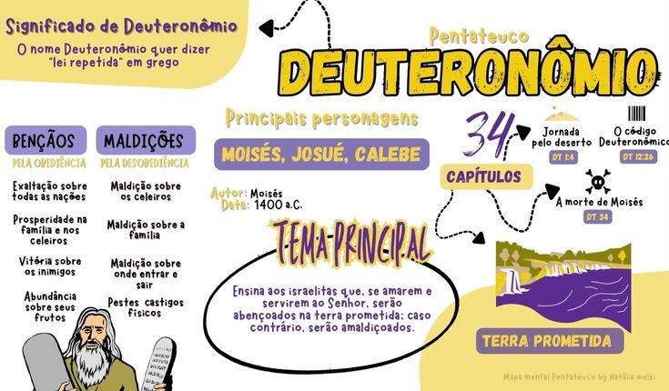 O livro termina com Moisés contemplando a terra de Canaã do alto do Monte Nebo, um momento simbólico que encerra sua liderança e marca o início de uma nova era sob Josué.