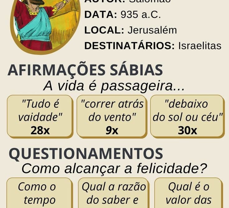 O livro desafia o leitor a olhar além das aparências e perceber que a verdadeira felicidade não se encontra no trabalho, no prazer ou nas riquezas, mas em uma vida vivida com reverência e obediência a Deus. Ele nos ensina que, embora a vida sob o sol pareça incerta e passageira, há um propósito divino maior que governa todas as coisas.