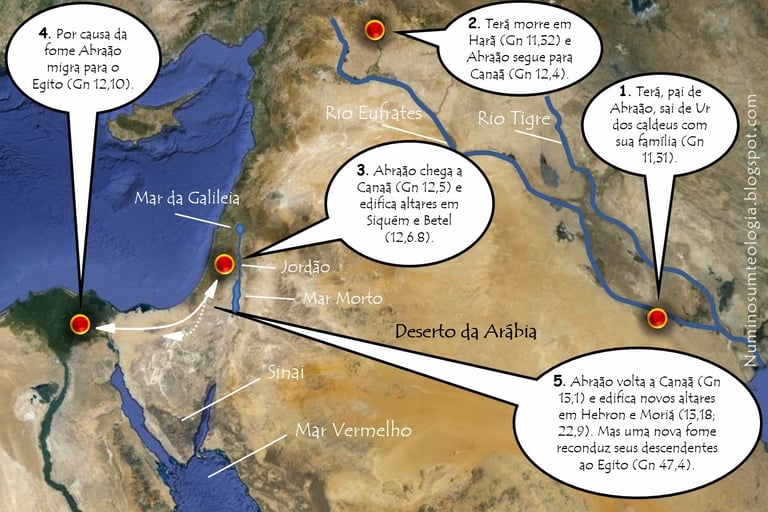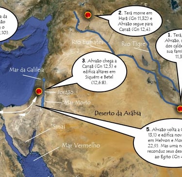 através dos mapas abaixo, você pode acompanhar parte da trajetória seguida por Abraão na época em que ele estava desempenhando seu papel em seu ministério