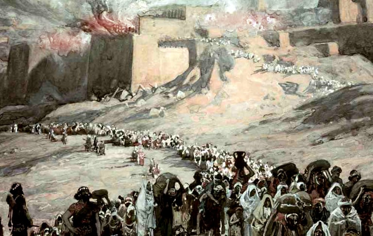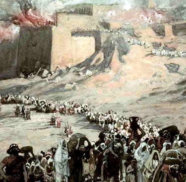 O exército babilônico invade Jerusalém, destrói o templo e leva o povo cativo.