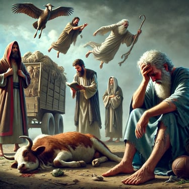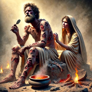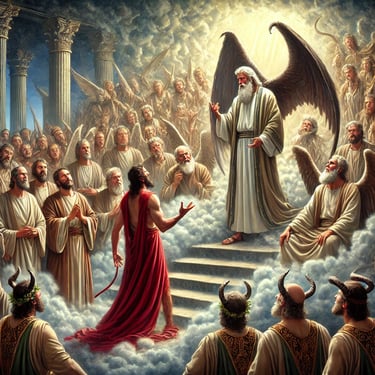A narrativa começa com um conflito no céu, onde ha-satan desafia a fidelidade de Jó, alegando que ele só serve a YHWH por causa das bênçãos materiais. Esse cenário reflete o conflito espiritual que permeia a existência humana, onde a fé é testada não pelo que recebemos, mas pela confiança inabalável no Criador (Lucas 22:31-32).