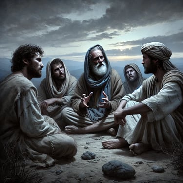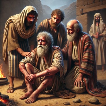 Os amigos de Jó, ao saberem de seu sofrimento, viajam para confortá-lo, mas acabam acusando-o de ter pecado.