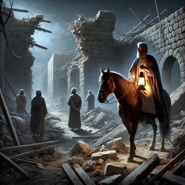 Neemias inspeciona os muros em ruínas durante a noite, planejando estrategicamente a reconstrução sem alardear seus planos aos inimigos.